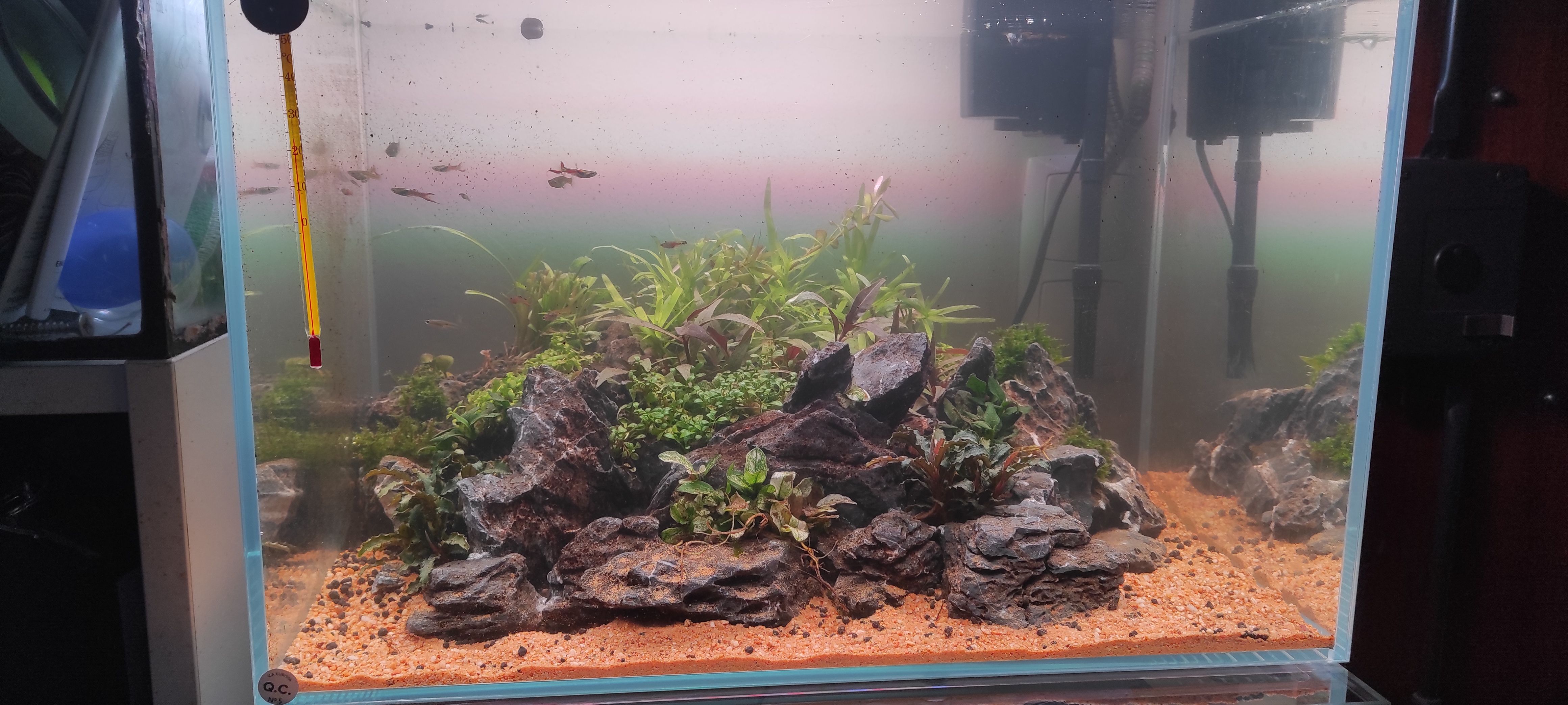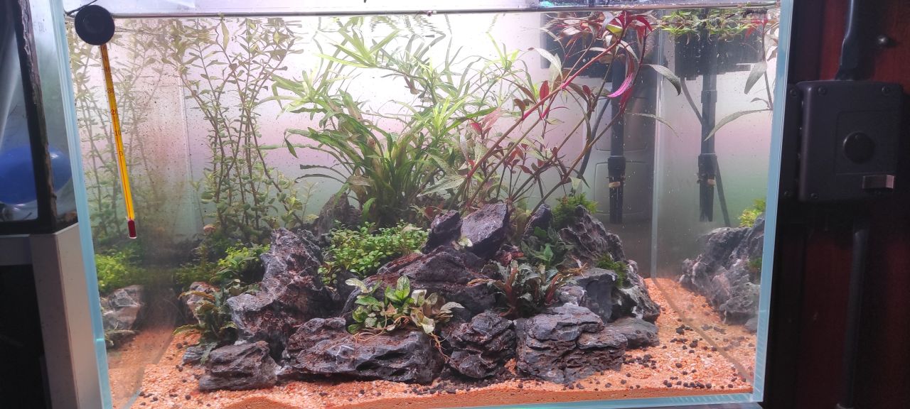 Fiz uma troca de água total, com água de um aquário maturado, onde não tenho plantas e como está a aparecer uma alga castanha nos vidros, adicionei uns guppys e caracóis que estavam nesse aquário, para iniciar a limpeza e estabilizar o ecossistema.