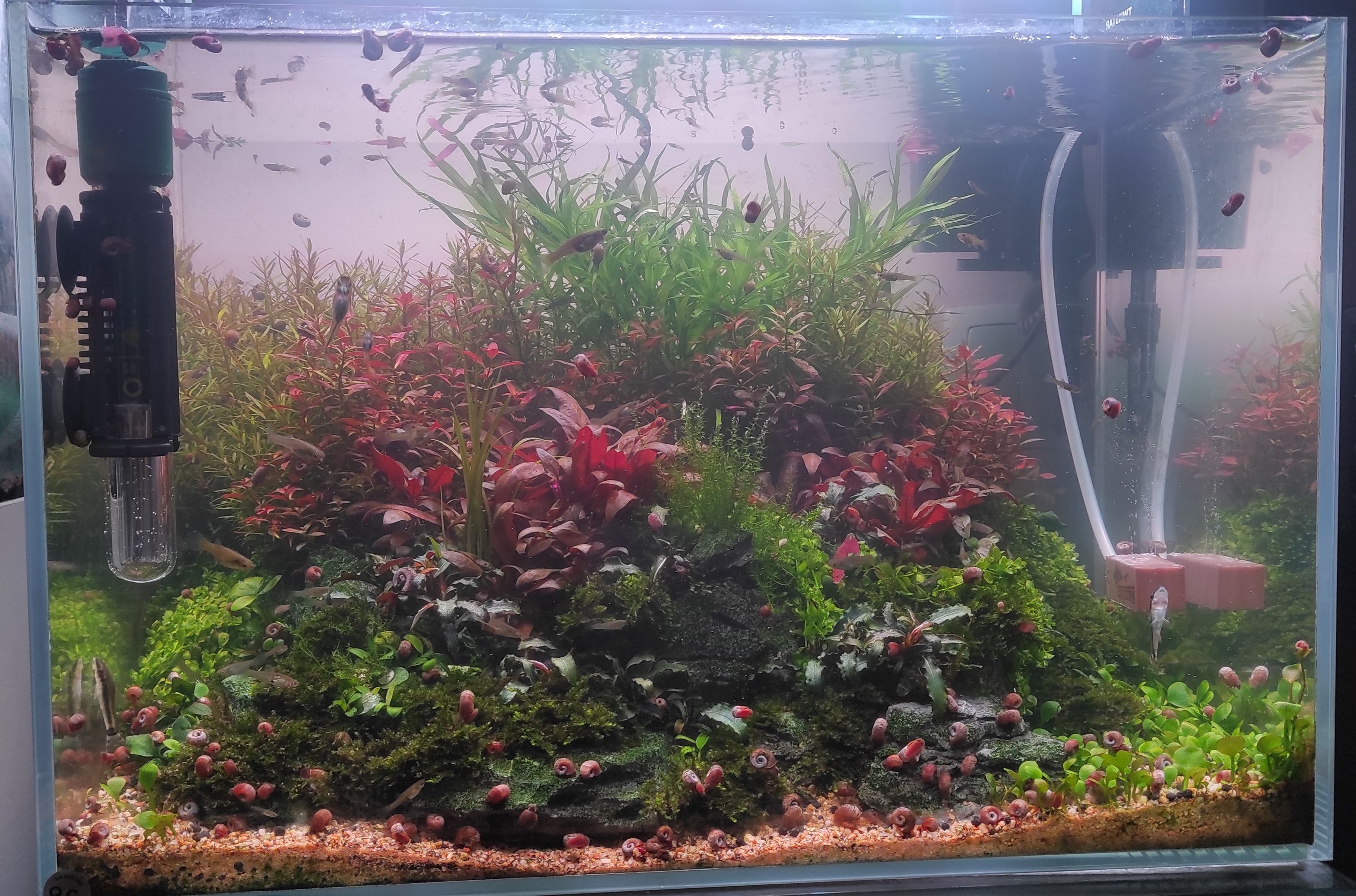 Primeira actualização de 2026. A poucos dias de fazer a fotografia para ser enviada para os juízes avaliarem e comentarem... As cores estão top A UG finalmente decidiu aparecer, não com a pujança do ano passado e apenas porque veio junto com um pouco de musgo que o @Vasco Ferreira me ofereceu no dia da montagem! Mas nem tudo são rosas, os otocinclus morreram quase todos, dos 6 sobra 1 para já... Eu desconfiei que fosse a dureza e quando testei o gH fiquei surpreendido pelo resultado, 13°!!! Será possível? Ou o teste está estragado?1 point