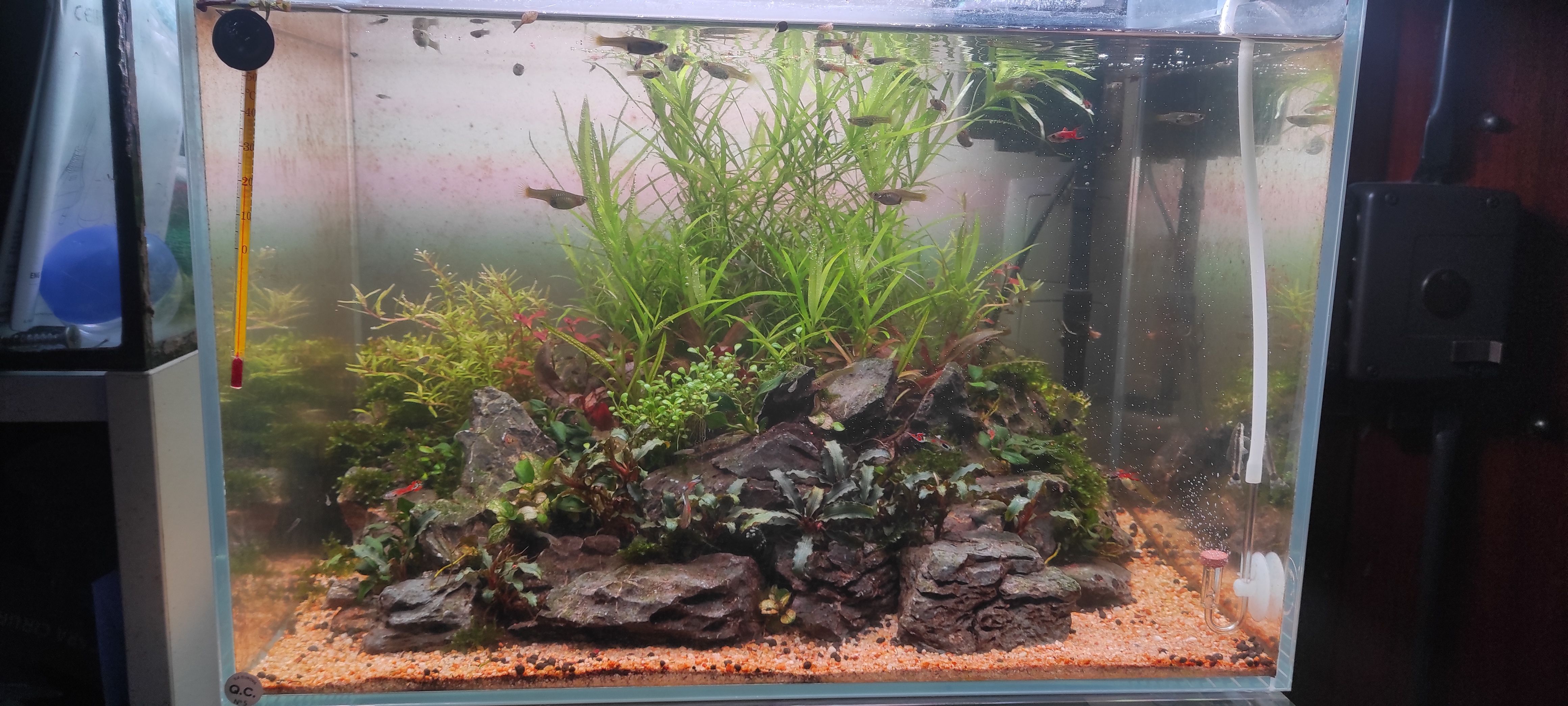 Aqui fica uma actualização do que fiz desde a última vez: - Fiz uma distribuição de algumas plantas que já davam para dividir, para complementar os sítios "mortos" - Fiz uma troca de água total - Aumentei a intensidade da iluminação para o máximo para testar o efeito no aquário - Introduzi ontem, 2 Neritinas Ficou assim: Com o aumento da intensidade da iluminação, vi cores nos peixes espetaculares , mas tive um boom de algas e as plantas deixaram de crescer na horizontal... E também amarelaram um pouco, apesar da fertilização ser a mesma. Vai voltar para os 30% que era onde estava equilibrado. De resto tudo ok Devo de colocar o CO2 a funcionar esta semana, para ajudar as plantas a desenvolver e combaterem as algas e vou introduzir uns Ottocinclus e camarões.2 points
