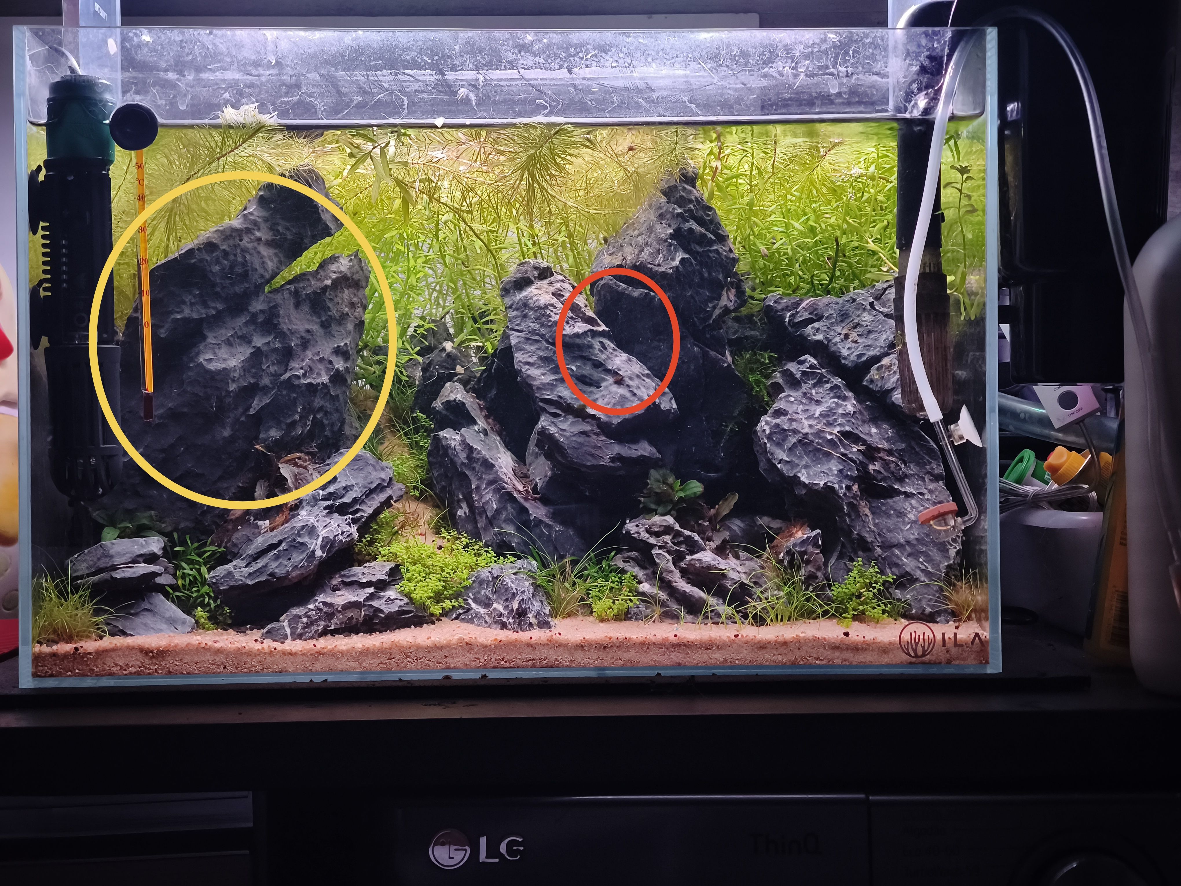 Percebo o que dizes, refereste a onde exatamente? Acrescentar plantas onde? No vermelho posso acrescentar musgo,esteve lá anubias meltaram o amarelo é uma rocha unica, tinha colado plantas mas meltaram, cuba e anubias, não há muito por onde fazer, a não ser um pouco de musgo também e mais anubias. Lá atrás há uma rocha que não se vê sem poda. Tirei uma foto hoje, está tipo selva, o bom é algas zero, o co2 acabou no fim de semana, e como é habitual esqueço-me sempre de fertilizar 😅 Quinta feira faço poda e actualizo.1 point