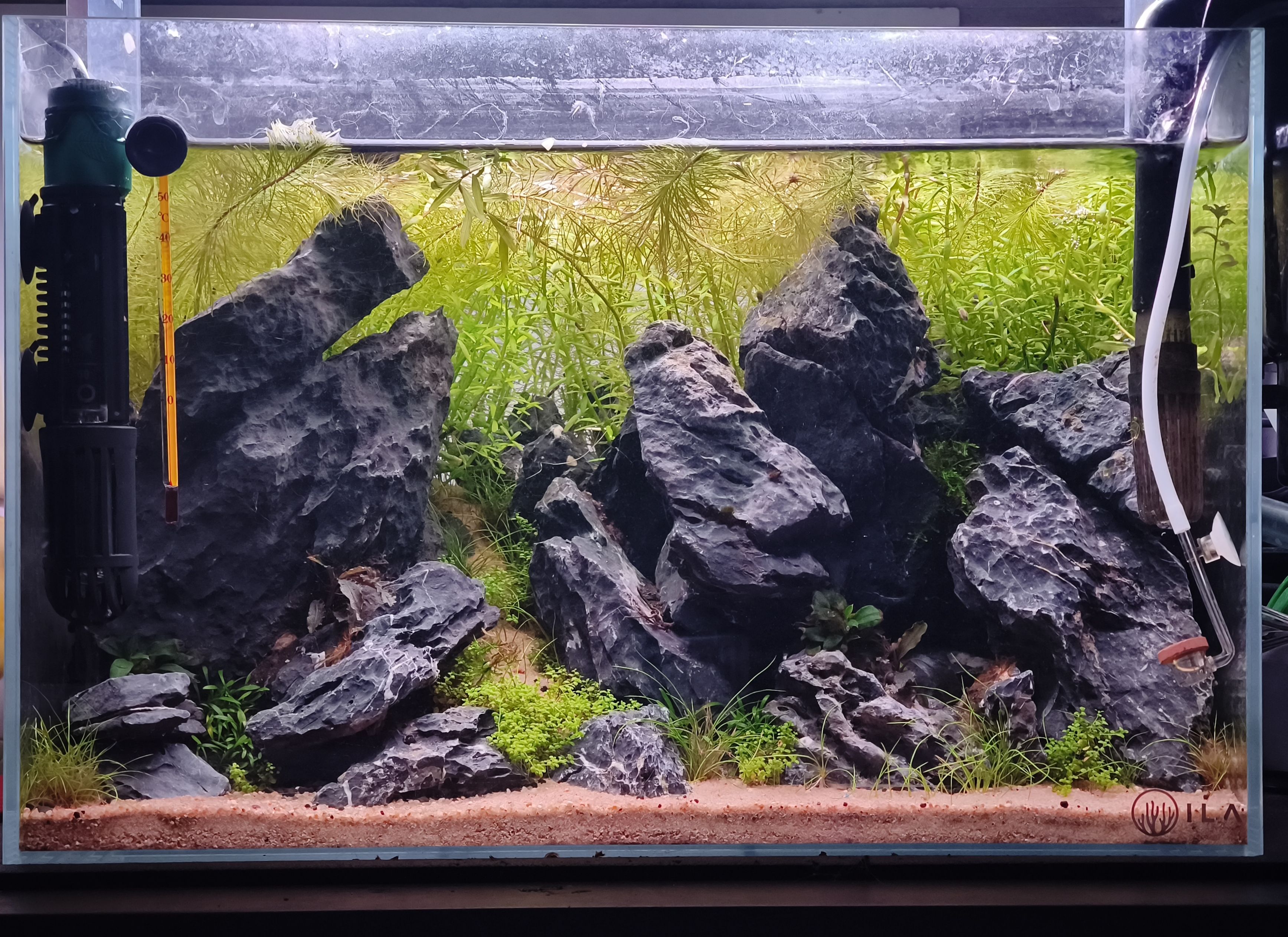 Boa noite a todos... ora como já há algum tempo que não fazia uma atualização do estado do aquário, ora quie vai algumas fotos com datas diferentes para poderem acompanhar o desenvolvimento. Ora aqui fica uma imagem depois de alguma poda nas Rotalas e a remoção da Anubia que se encontrava a entregar a alma ao deus do Melt. Agora nas seguintes fotos, deixo o antes e o depois da TPA de hoje, da poda das Rotalas e mais uma alteração visual, desta vez removi a Bucephalandra. Como dá para ver pela foto, estou a ter alguma dificuldade em em manter a Cuba na zona central, provavelmente pela sobra da pedra.1 point