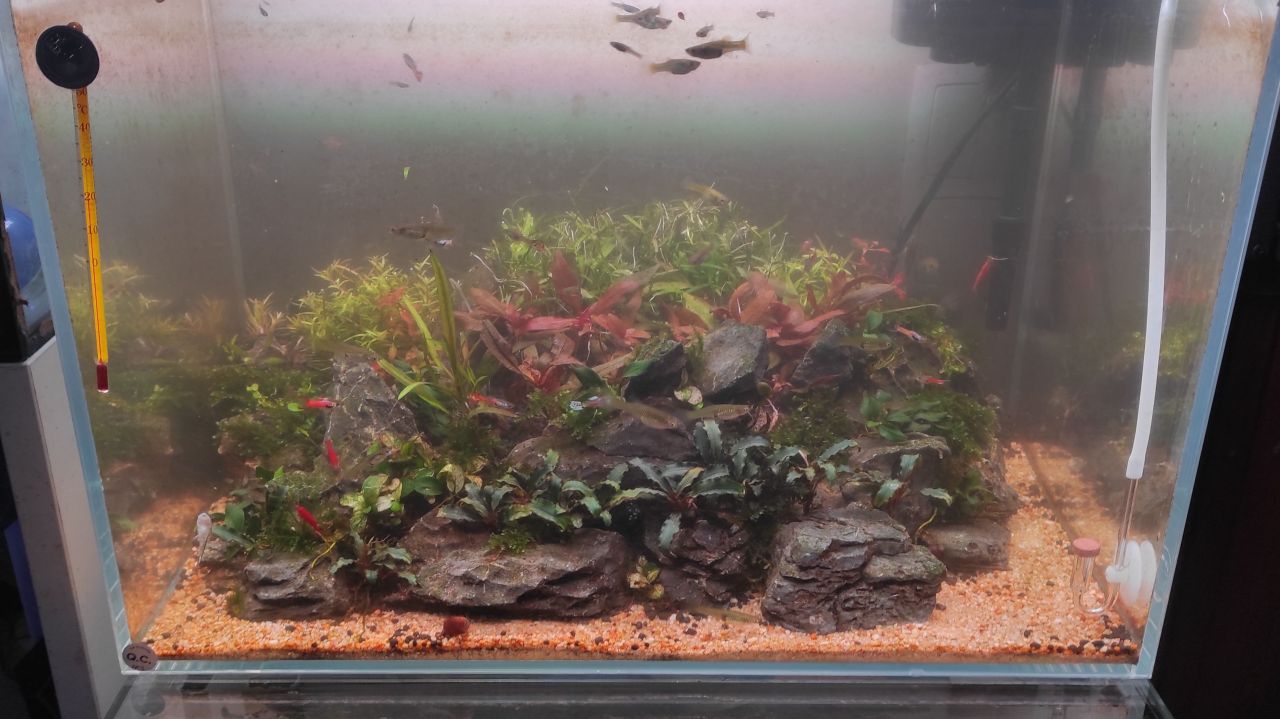 Desde a última atualização fiz algumas adições à fauna. Entraram para o aquário Corydoras pygmaeus, Otocinclus vittatus, Neocaridina davidi (red cherry) e também uma Neritina sp.. Todos se adaptaram bem e estão a apresentar um comportamento ativo e saudável. Continuam a aparecer algumas algas, embora em menor quantidade, e tenho mantido o controlo com manutenção regular e ajustes na iluminação. As plantas, por outro lado, estão a crescer muito bem. Já fiz duas podas desde a última atualização, o que ajudou a manter a forma e a densidade desejada no layout. De forma geral, o aquário está estável e a evoluir de forma positiva.4 points