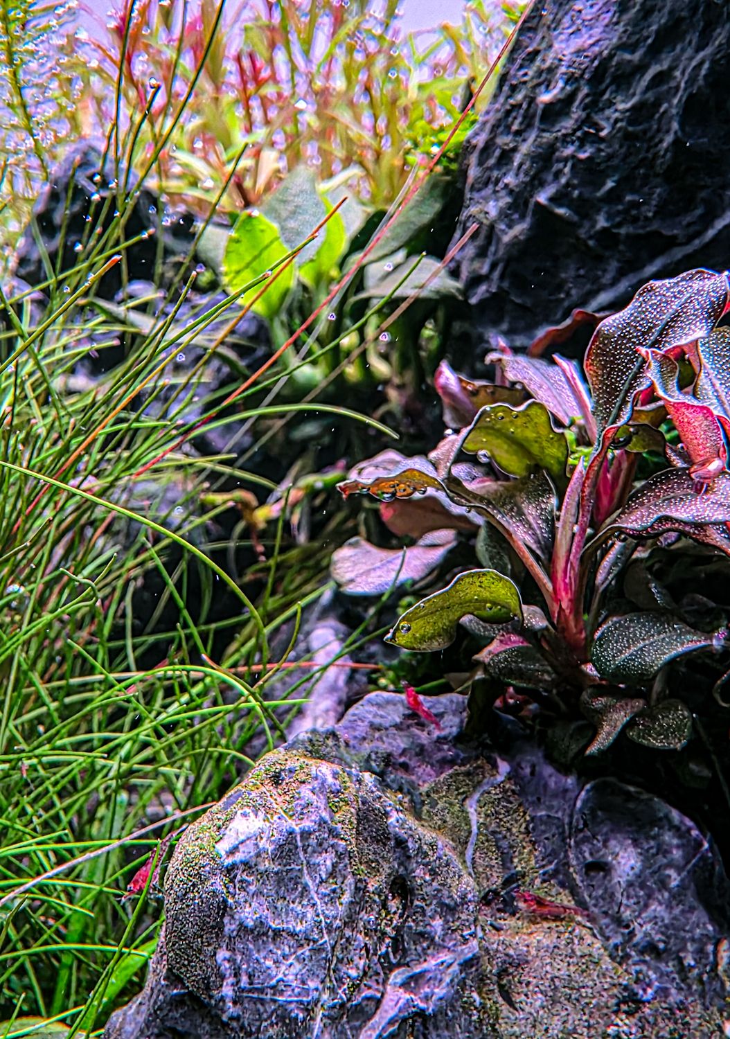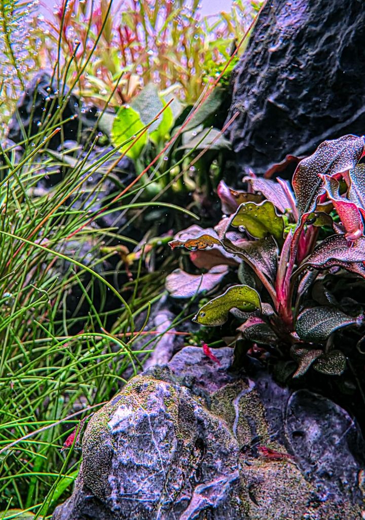 Mais um update...... Adicionei rasboras espei e umas caridinas crystal red e uns caracois clithon. De fauna acho que já está tudo la dentro. Os amanos andaram a desenterrar tudo então tive que adicionar mais umas pedras para segurar o solo. Comecei a ver umas algas green spot e adicionei fosfatos á fertilização. Já comecei a ver uns esboços de cor nas rotalas e na vietnam. A UG finalmente está a recurar. Agr é esperar que isto desenvolva mais um pouco1 point