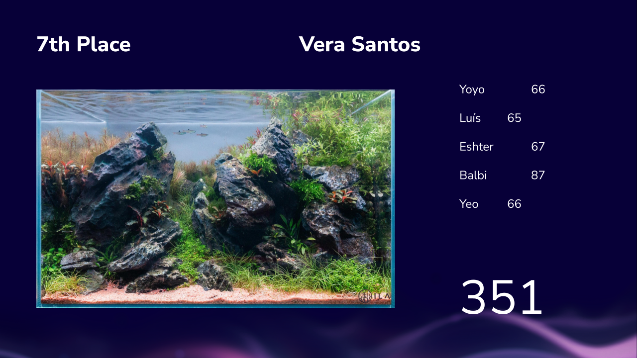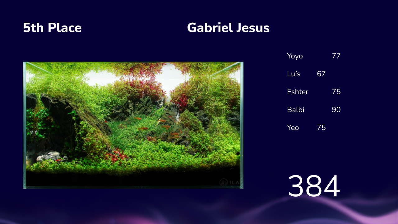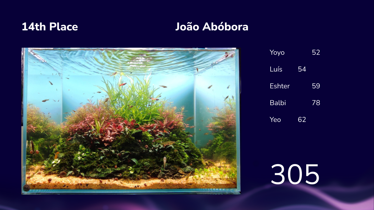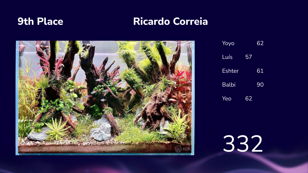 Ontem encerramos o 6º desafio com a cerimónia de classificação final após avaliação pelos 5 juízes convidados. Sim, é verdade, temos o privilégio de já termos avaliados pelos mestres vencedores do maior concurso de aquascaping mundial nestas 6 edições: Depois de Josh Sim ( 2017/19/25), Takayuki Fukada (2015/16), Luca Galarraga (2024), Matthew Manes (2022), temos mais 2 cromos na caderneta: O vencedor do IAPLC em 2021, Yoyo Prayogi e o campeão IAPLC em 2020, Siak Wee Yeo Adicionando a estes dois ilustres aquascapers tivemos a avaliação do nosso campeão lusitano, o @Luís Cardoso , da CEO da Aquaflora Esther Mous e da Balbi Vaquero que além de ter avaliado as fotos, tivemos o privilégio de receber ao vivo nesta edição da petfestival. Foi no nosso espaço na FIL que criamos uma galeria de aquascaping com os aquários do desafio para também o público poder votar tendo o publico elegido em 1º lugar o @ismael_figueira, em segundo o @Ricardo Correia Nature Art e em 3º o @Luis Ruivo e depois foi então apresentado a classificação final desta 6ª edição de aquascaping aquariofilia.net: -