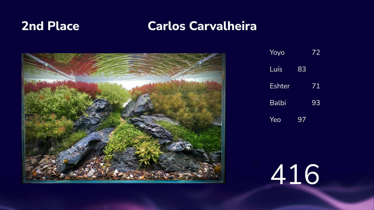 Parabéns Carlos. Que belíssima montagem! E os juízes gostaram! Um deles até te deu a pontuação máxima no que toca à saúde das plantas! Boa profundidade, gosto do efeito do hardscape. Plantas cuidadas, e bem podadas, gostava de ver melhor mistura de cores, para evitar as transições abruptas entre as cores que se ve, em especial no lado esquerdo onde temos o vermelho /verde sem transição entre ele. A gravilha no plano frontal retira belea ao aquário por não se enquadrar bem com a rocha utilizada. Parabéns pelo trabalho Luis Cardoso -