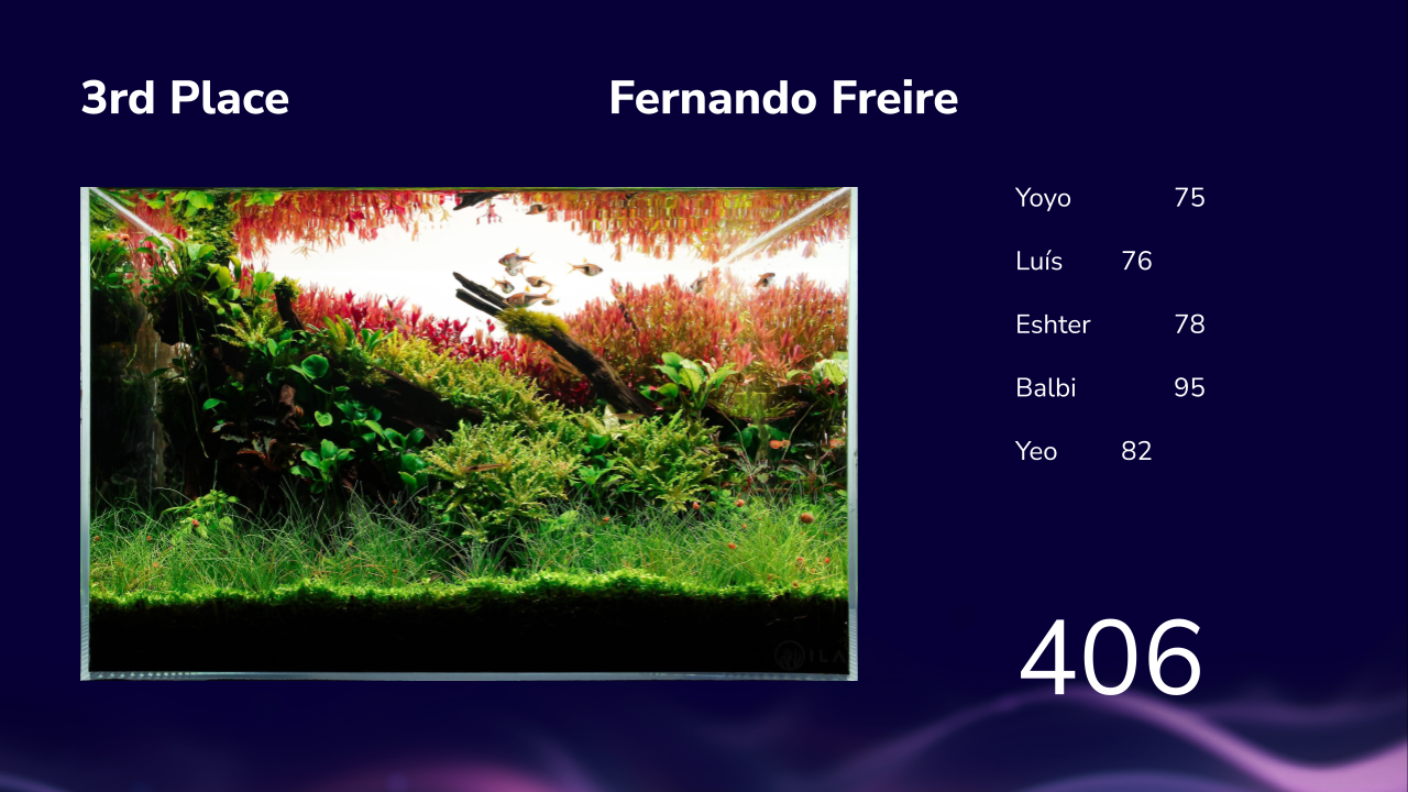 Grande Fernando! Top 3!!! Parabéns! Aquario bem mantido, com plantas com cores muito boas. Sinto falta de ver mais hardscape e o plano forntal é muito "flat", não tem dinamismo. Um melhor integração de mais plantas no mesmo poderia dar um pouco mais de movimento. Parabéns Luis Cardoso -