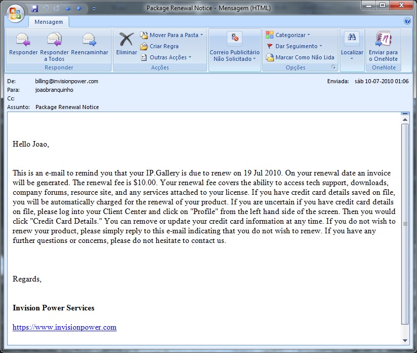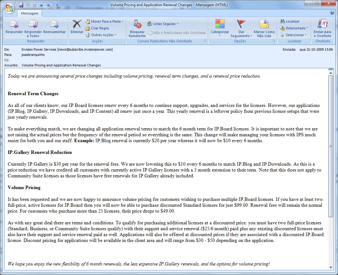 João Branquinho Publicado: Julho 10, 2010 Publicado: Julho 10, 2010 Nem de propósito... chegou hoje o email a informar que está na altura de pagar a manutenção da galeria de imagens... 10$ por 6 meses. O tal custo que foi dito que não existe... E aproveito para anexar também o email em que informaram a alteração dos preços de suporte no final de 2009, pois também foi dito que os preços nunca alteraram... Aqui fica a informação para quem na altura demonstrou interesse em saber, apesar de estar tudo escrito no portal do IPB, e apesar de neste caso concreto, estarmos a falar de valores perfeitamente irrelevantes... a manutenção da galeria custa 20$ por ano... ONDE OUVISTE FALAR DO FÓRUM PELA 1ª VEZ? VOTA! - Discus - 1º Salgado - 2º Salgado - Dúvidas sobre aquariofilia devem ser colocadas no fórum e não enviadas por MP. Dúvidas/sugestões sobre o fórum devem ser colocadas nas Sugestões e Novidades do fórum. Aqua Team: 20.563.645 Points (Rank: #3304) Join World Community Grid today!