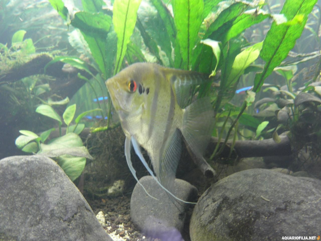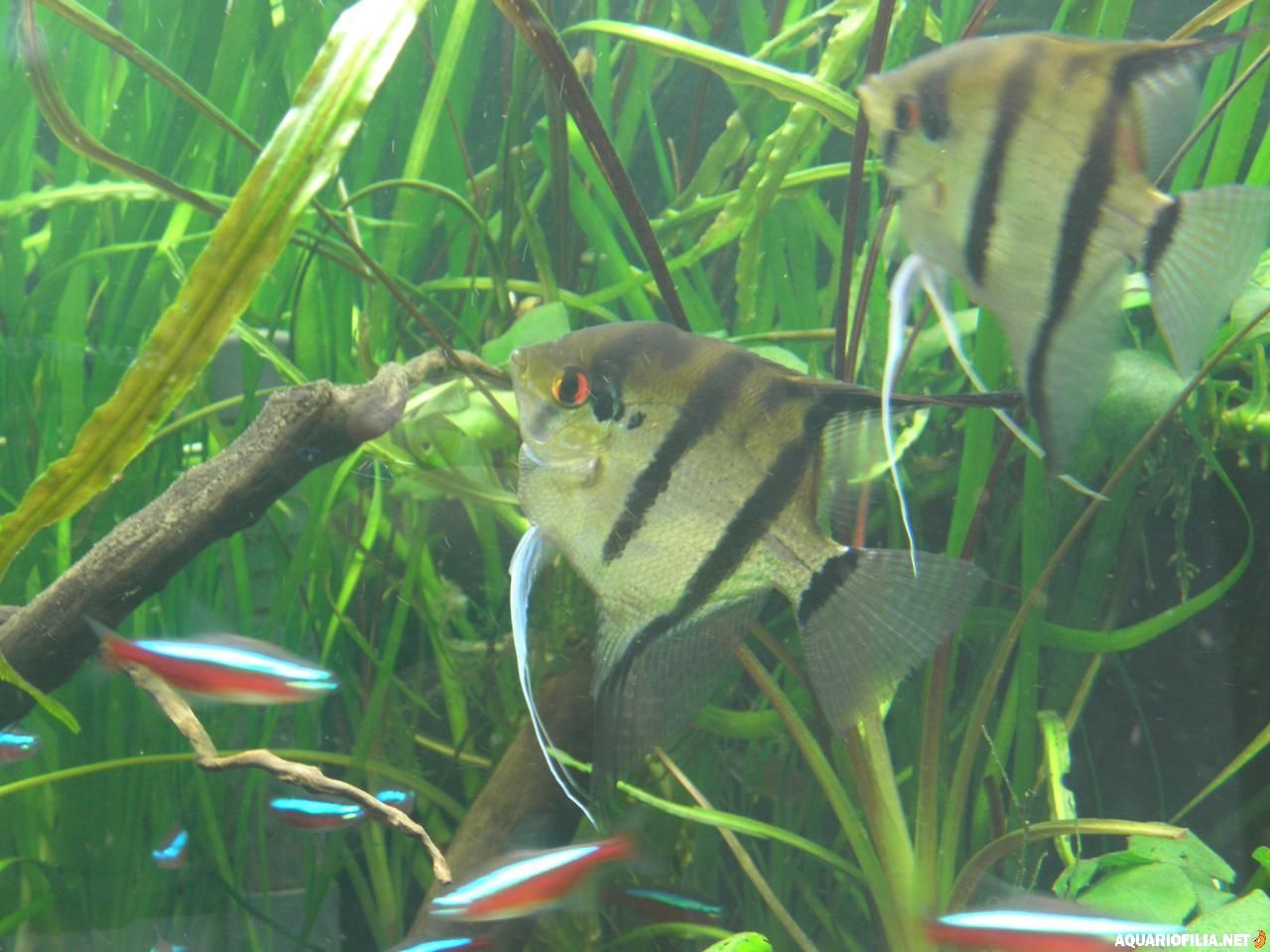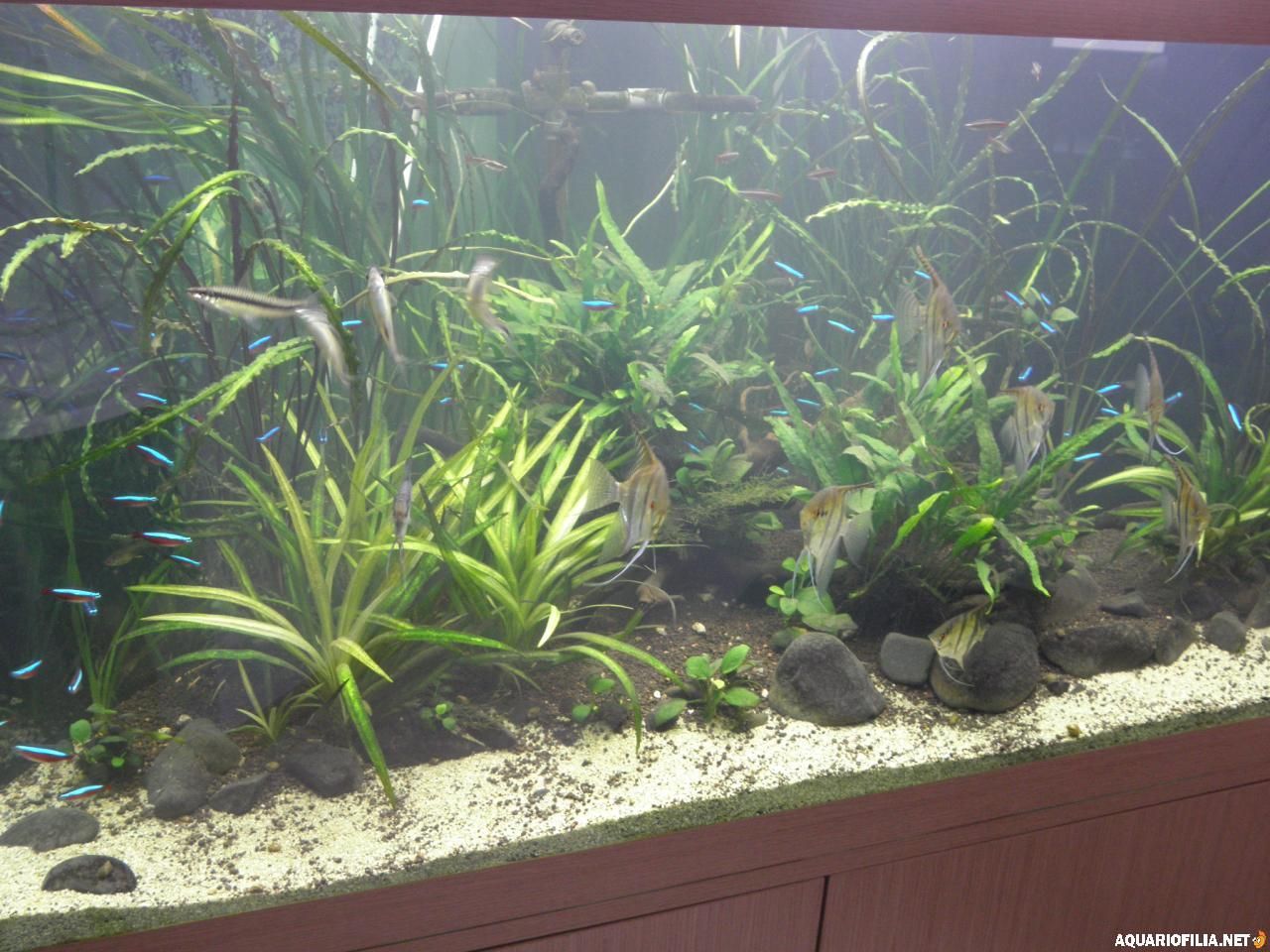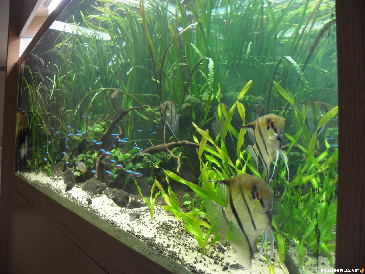 nuno_79 Publicado: Junho 18, 2010 Autor Publicado: Junho 18, 2010 Sem grandes novidades, hoje vai ser o ultimo dia de tratamento com esha hexamita, pelo sim pelo não desparasitei os escalares, andavam com umas fezes esquesitas e um deles tinha uns pontos negros que agora estão a desaparecer, se bem que não sei se é coloração do proprio peixe ou algum parasita, em relação a temperatura tambem consegui estabilizar nos 26 º, reduzi no termometro para 24º e levantei ligeiramente a calha. Aqui ficam umas fotos gerais do estado das coisas( desculpem a qualidade) e umas dos meus meninos:( já agora, são juvenis mas já mostram a sua personalidade, 1º conseguiram que os cardinais funcionassem como cardume, coisa que não acontecia é vê-los de um lado e os cardinais do outro ou então quando se cruzam os cardinais metem uma a baixo e aceleram pelo meio dos escalares, lindo, só visto! 2º agem como um gang, sempre juntos a patrulhar o aquario, até os physas levam bicadas á sua passagem...) Vejam a cara de mau... Agora que coloco as fotos reparo que já mais peixes apresentam as tais pintas pretas, alguem sabe do que se trata: As tais pintas aqui bem visiveis , serão parasitas ou pigmentos que os peixes vão ganhando? Hoje se tiver tempo vou tentar tirar umas fotos melhores e quando puder vou actualizando. Citar