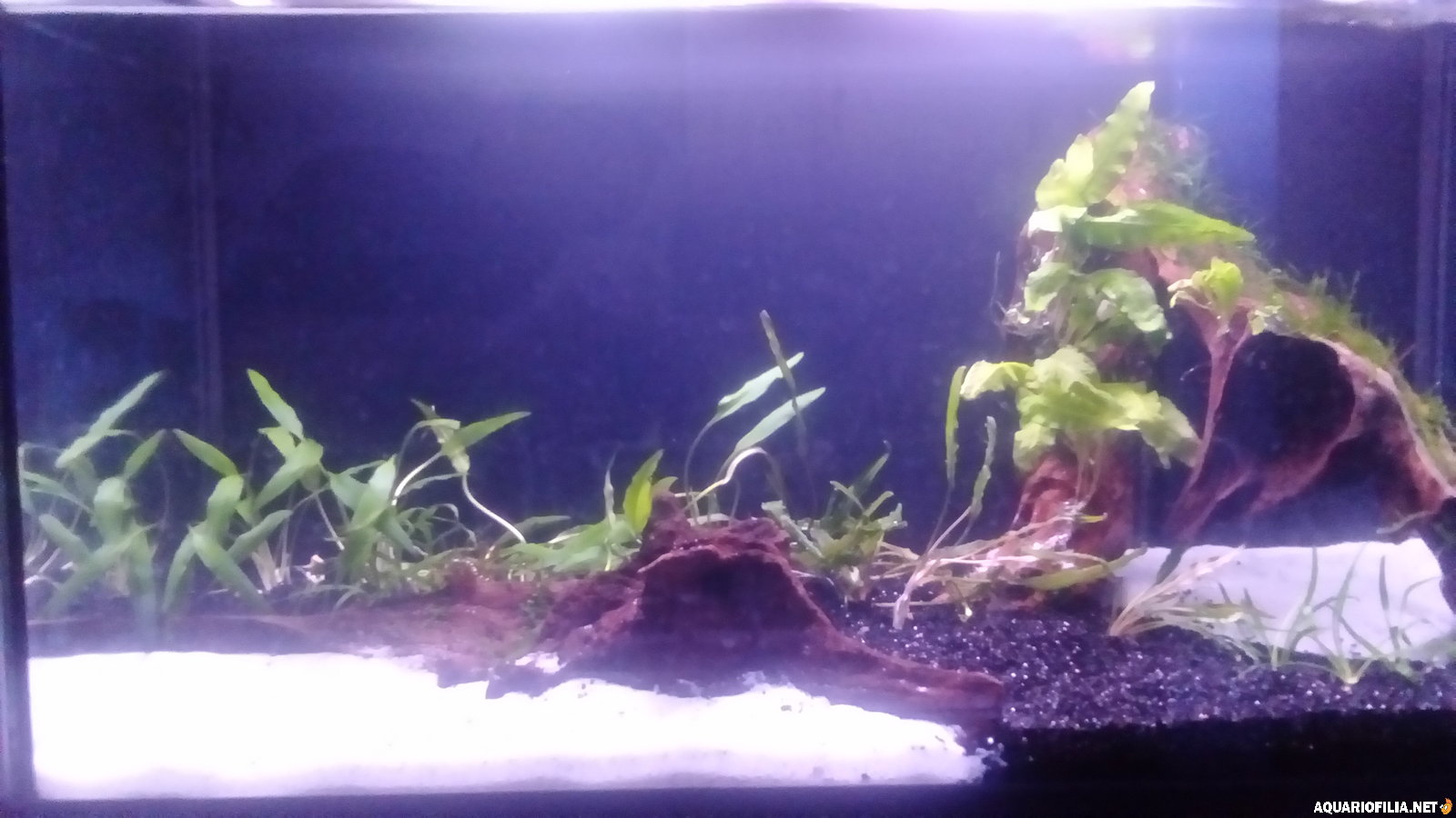 brunofasoares Publicado: Outubro 29, 2018 Autor Publicado: Outubro 29, 2018 Então novidades. Este sábado foi desmontado o "Honey I Shrimped the Kids" e o aquário foi aproveitado para esta montagem. Os Golden passaram para junto dos Red Cherry. Lá ficam por agora. Ontem fez-se a montagem, que deu algum "trabalhinho", mas valeu bem a pena. O aquário está no meio da estrutura e o espaço para trabalhar é muito pouco, por isso a montagem foi feita fora e o aquário só foi colocado depois de estar pronto o layout e a plantação. Ainda vão entrar mais algumas plantas, mas para já é assim. O filtro não parou desde a desmontagem e ficou sempre a trabalhar para dentro de um garrafão de água. Levou uma pequena lavagem e mudei uma das esponjas que estava bastante suja. Como o filtro está mais que ciclado, quanto tempo acham que vai demorar a fazer a ciclagem desta montagem? Será 3 semanas suficiente? O mais seguro seria testar... A água ainda estava turva quando tirei a foto, porque só terminei a montagem perto da meia noite. Foi tirar foto, apagar as luzes e dormir. Ainda vai entrar pelo menos uma bucephalandra e mais uma crypto, a principio a Pigmaea. Vamos ver. Para já é assim. Logo se procura mais "inspiração". 1 Bruno Soares http://www.aquariofilia.net/forum/topic/255024-honey-i-shrimped-thekids/ https://www.aquariofilia.net/forum/topic/257876-apistogramma-cacatuoides-orange/?tab=comments#comment-1414645 1ª Montagem de água Salgada: https://www.aquariofilia.net/forum/topic/259497-b-reefing/