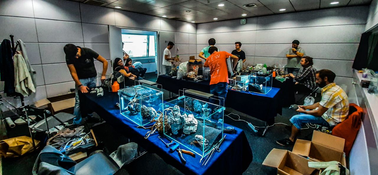 A sala está preenchida com todo o material necessário para a segunda  edição do desafio de aquascaping aquariofilia.net. Amanhã a partir das 10h na sala 1.16 do pavilhão 1 na FIL, 12 aquascapers vão montar doze  aquários plantados ao vivo. Venham participar, a entrada é  grátis.