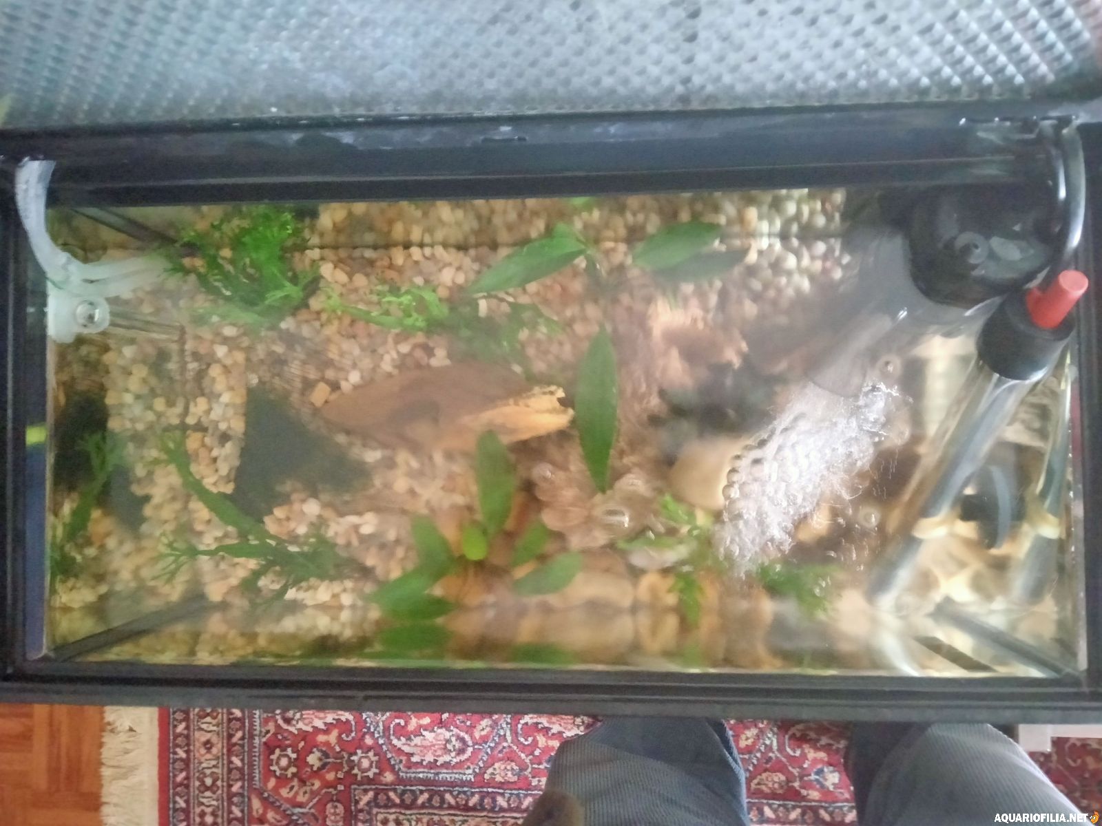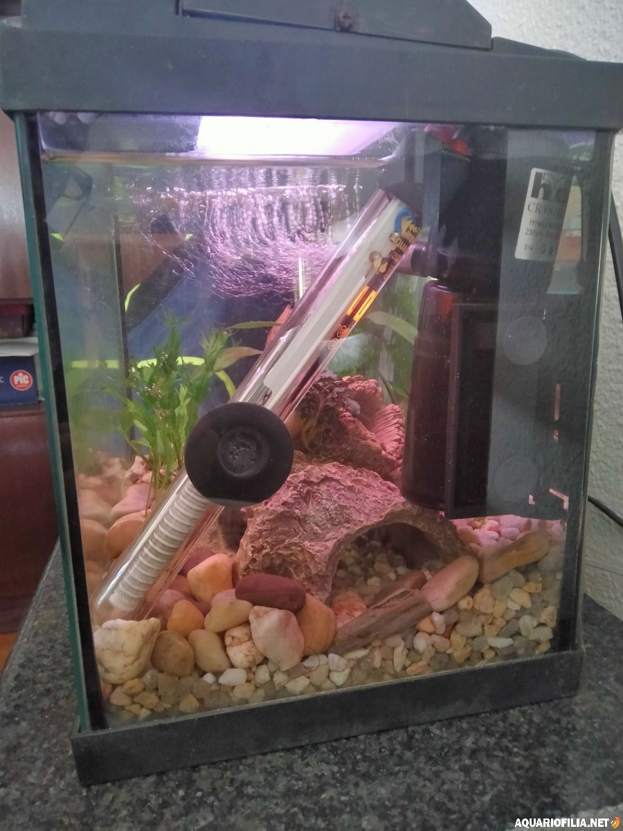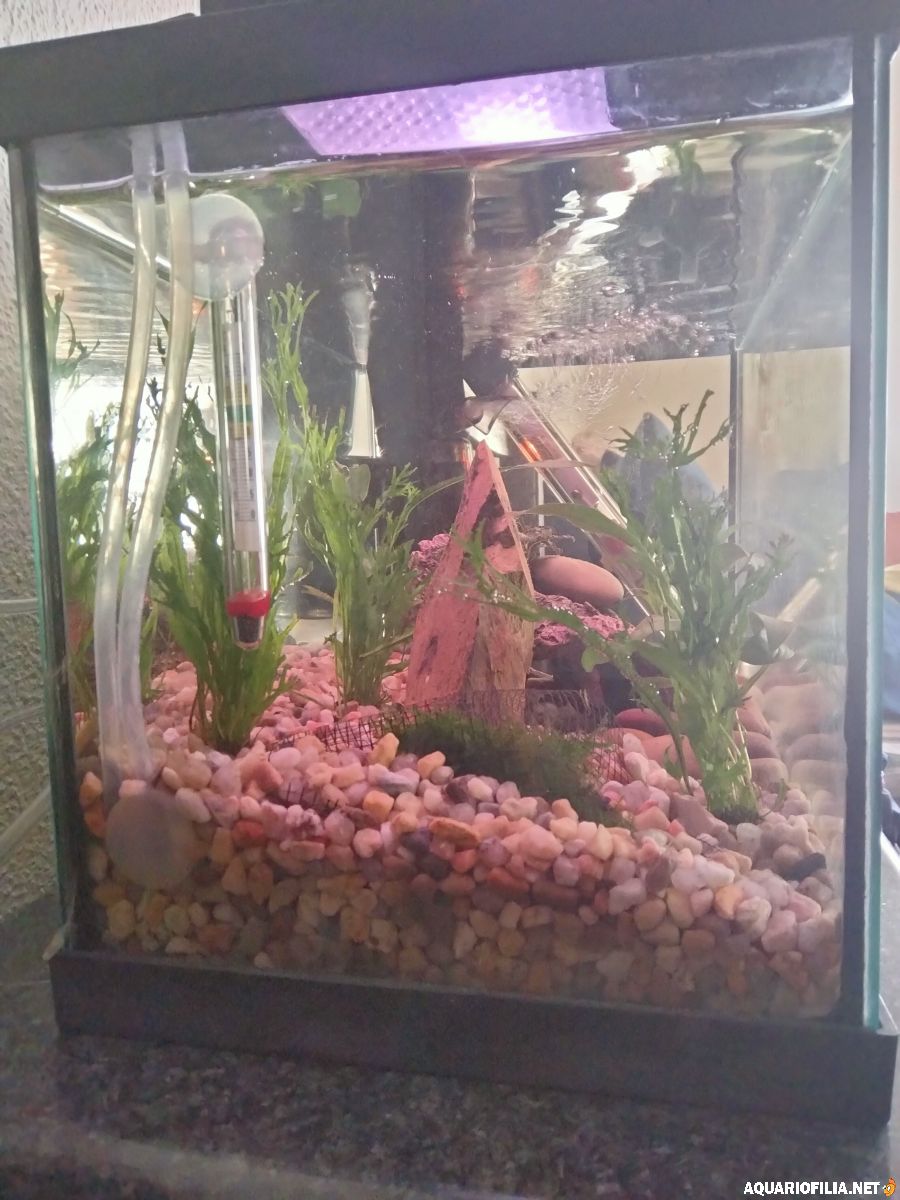 Armando M. Publicado Abril 25, 2022 Publicado Abril 25, 2022 (editado) Bom dia, Procuro não cometer os erros do passado, então tenho consultado alguma da informação disponível e planeei o meu aquário. Peguei no aquário que estava guardado há mais de 30 Anos e comecei a construí-lo. Preparei o aquário com calma e sem pressas. No dia 09/04/2022 coloquei plantas naturais, 15 litros de água, condicionador usado: Sera aquatan, equilíbrio biológico : Bio nitrivec e coloquei-o em funcionamento. Setup – Aquário Data da montagem : 09/04/2022 Aquário : 40x20x22 Volume bruto 20 L, útil 15 L Luz : 8w ligado das 08 H ás 20 H Filtro : Filtro Interior - Hydor Crystal K10 II 200 l/h Aquecedor : THPL regulável 50W Substrato : Cascalho do rio Decorações : Pedras e tronco artificial Fertilização : Premium Nutrition da Tropica Plantas : Anubia, Microsorum, Bucephalandra, Vesicularia Montagnei - Christmas Parâmetros da água (pH = 7, NO2 = 0, NO3 = 0, temperatura = 24º) Peixes : Ainda não tem Editado Abril 25, 2022 por Armando M. Citar