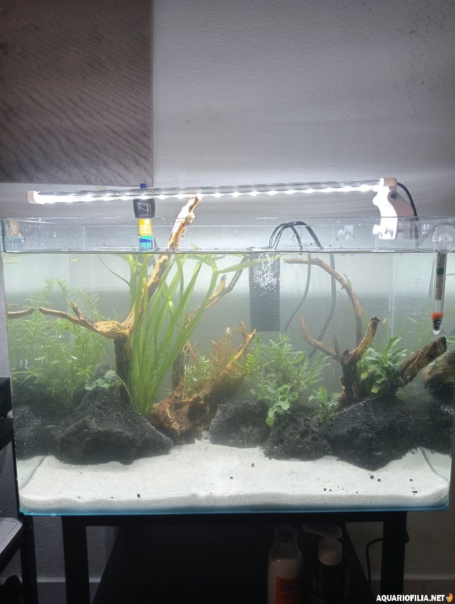 carolinambs Publicado Agosto 22, 2022 Publicado Agosto 22, 2022 Boa noite, sou nova por aqui e há algumas semanas que ando a pesquisar e a ler aqui pelo fórum a tentar esclarecer todas as dúvidas que têm surgido. Depois de muita insistência por parte do meu namorado decidimos meter nos nesta aventura da aquariofilia. Adquirimos um aquário de 40L, compramos um termostato e um filtro interno de 200L/h. Fomos a uma loja onde adquirimos as plantas, o substrato, algumas pedras e uns troncos para finalmente montar o aquário. Foi uma aventura conseguir colocar tudo lá dentro e fixar as plantas mas para já acho que podia ter sido pior (para 2 iniciantes como nós). Metemos água e ligamos o filtro (20/08/2022) Hoje deparei me com um inquilino clandestino, um caracol minúsculo que mal se vê xD deve ter vindo de brinde com as plantas. A minha dúvida neste momento prende se com o próximo passo, estou farta de pesquisaras tenho medo de fazer asneira e por isso achei melhor perguntar 😊 Citar