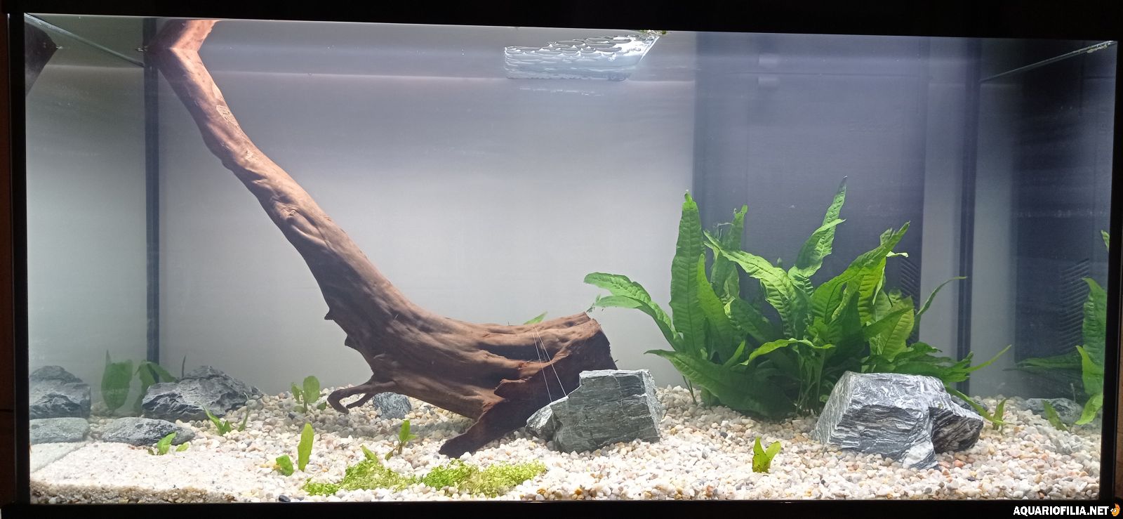 nunomorgado Publicado: Março 7, 2023 Autor Publicado: Março 7, 2023 Passou uma semana, restruturado. Adicionei Vallisneria, Alternanthera e a que está no canto esquerdo que não me recordo do nome, cresce muito. Coloquei Plant Gro de acordo com o recomendado na embalagem, não tenho teste de Fe. Alterei o layout, por indicação do JoseCarlosMarques coloquei os fetos atados às pedras e o rizoma fora do substrato. Adicionei mais algumas pedras e coloquei o filtro na lateral, essa lateral está tapada com um móvel-coluna. Retirei a box carvão activado e coloquei uma box de cerâmicas. PH = 7,5 NH4 = 0 NO2 = 0 NO3 = 1 Citar