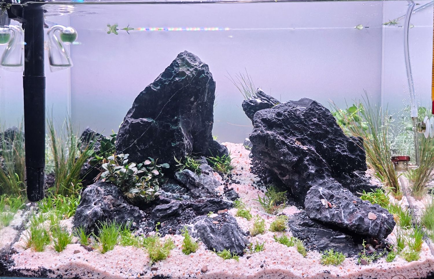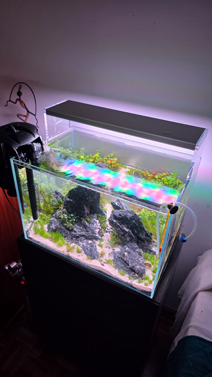 Tozé Nunes Publicado 3 horas Publicado 3 horas Ora cá estamos nós para mais uma edição do desafio de aquascaping aquariofilia.net! A sexta! 1 - Nome do Aquário Zaboeira Quem segue as minhas montagens já se habituou a que as batize com nomes de locais onde passo parte das minhas férias e onde está a maior parte da minha família. Desta vez homenagem a uma belíssima aldeia junto à barragem de Castelo de Bode que recomendo visitar. Além das imagens estonteantes da natureza, a aldeia maioritariamente com casas de xisto e uma praia fluvial são motivos extra para a visita. 2 - Data da montagem 28/09/2025 3 - Dimensões do aquário ILA 45x30x30 extra claro, colagens invisíveis. Empresa portuguesa que nos apoia desde a primeira edição com magníficos aquários. 4 - Equipamentos Instalados 4.1 - Filtro Aquael Versamax FZN1 filtro externo "cascata" 500 l/h 7,2 W para aquários de 20 a 100l (de acordo com o fabricante polaco). Vem equipado com duas esponjas que preenchem completamente o espaço interior, retirados para colocar material biológico já ciclado de outro aquário e um saco de Sera Siporax bio active e completei com lã filtrante. Depois e no ano passado ter trocado este filtro pelo Oase 115, este ano por falta de espaço para colocar o Oase atrás, voltei a este filtro. 4.2 - Termostato Sera aquarium heather 50W Uma novidade desta edição! Pela segunda vez conseguimos que todos os aquários do desafio tenham um termostato adequado desta vez graças ao apoio da Sera. Este modelo é bastante mais curto que os que foram usados na edição anterior de outra marca. E se há lema adequado aos nano aquarios é "size matters" 😁 4.3 - Iluminação/Foto-período Twinstar Light IV 450EC 28 leds laranja e 52 RGB 37 W, 1850 lumen, 8300 K. Foto período de 8h. Desta vez houve a possibilidade de usar o novo controlador por bluetooth que permite através de uma aplicação no telemóvel alterar o foto- periodo, intensidade de luz e criar um sunrise/sunset além de permitir programar isto por 25 dias, bom para quem no inicio quer manter a calha a metade do máximo. No meu caso, na primeira semana esteve a 50% durante 6 horas. 4.4 - Sistema de CO2 Strideways co2 reactor 8h/dia em extintor co2 2kg e difusor Twinstar 5 - Substratos & Hardscape 5.1 - Substrato 2HR Aquarist APT Feast Mais um ano, mais um substrato novo para testarmos! Desta vez, um solo tão poderoso que a marca aconselha o arranque via darkstart!!! 🙃 Claro que nós não fomos por este método, o desafio por si obriga que os aquários sejam plantados no dia da montagem. No entanto gostava de experimentar este processo um dia. Mas não quer dizer que vá correr mal, quer o distribuidor quer um lojista já usaram este solo e desde que se tenha cuidado em fazer múltiplas tpas nas primeiras duas semanas quer mantendo a iluminação a meio gás os resultados serão satisfatórios, a ver vamos como corre! É um desafio dentro do desafio 😁 Por baixo deste solo coloquei um pouco de Sera Gravel Lava que com a sua superfície porosa permite maior circulação de agua junto às raízes das plantas e também serve como um suporte para bactérias filtrantes. 5.3 - Hardscape Strideways Black Ryuoh Stone, Sera Mix Coarse Sera White fine Depois de na edição anterior ter usado também madeira, este ano voltei ao uso exclusivo de pedras, algo comum a muitos dos outros participantes do desafio, posso garantir que este ano os aquários estão pesados! 🤣 6 - Fertilização (fertilizantes utilizados e plano de fertilização) Apt 1 da 2HR 1ml por dia Fertilização sem nitratos nem fosfatos, adequada para uso nos primeiros 3 meses em montagens com substratos férteis que já incluem estes dois macronutrientes. Composto por sulfato de potássio, cloreto de potássio e sulfato de magnésio além dos micronutrientes necessários para um plantado sem algas 😁 Em complemento adiciono 3 ml/dia de 2HR APT fix para prevenir o aparecimento de algas Masterline carbo complemento de carbono liquido. E como tem glutaraldeído também actua como um anti-algas. 7 - Fauna N/A 8 - Plantas Segue a minha escolha para este ano: Hemianthus callitrichoides iv Elocharis sp minima iv Anubias pangolino Bucephalandra Maia iv Cryptocoryne parva iv Elocharis acicularis Rotala Yao Yai Higrophilla Pinnatifida Rotala rotundifolia hra Rotala rotundifolia Rotala Green Myriophyllum sp. guyana Desculpem o testamento, muito ficou ainda por dizer, segue as imagens do início: Hardscape finalizado, hora de recuperar forças 🤪 E depois disso, plantar, borrifar, plantar Depois, embalar e proteger para transportar. No final do dia já em casa e com agua e equipamentos: Agora é esperar que a natureza faça o seu trabalho e ir retocando as plantas conforme necessário. 4 Citar Adelaide Beehive- a Colmeia Scape no More! E se de repente... Crystal Beach Guesthouse Welcome to the JUNGLE